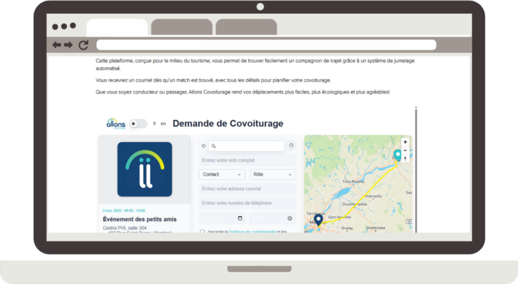 Événement, attraction touristique ou lieu de travail ? si tu veux simplifier l?arrivée de tes visiteurs, membres ou employés, Allons covoiturage est la solution qu?il te faut.